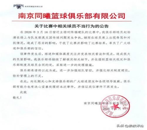 南京同曦官方回应表示:俱乐部将在了解核实事实后采取进一步举措,保证不再发生类似事件。