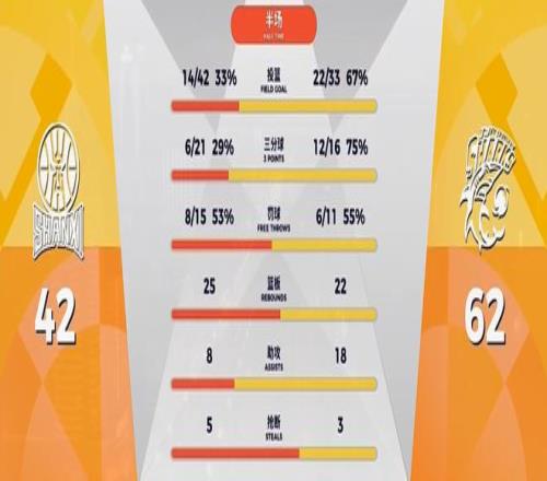 眼看着分差将近30分,山西队有所回应,焦海龙、于米提外线三分命中,迪亚洛突破得手,但全队的命中率始终在30%左右徘徊。半场最后时刻,李添荣命中个人第3记3分,“李花兄弟”三人合计三分球11中10,帮助大鲨鱼半场62-42领先对手20分。