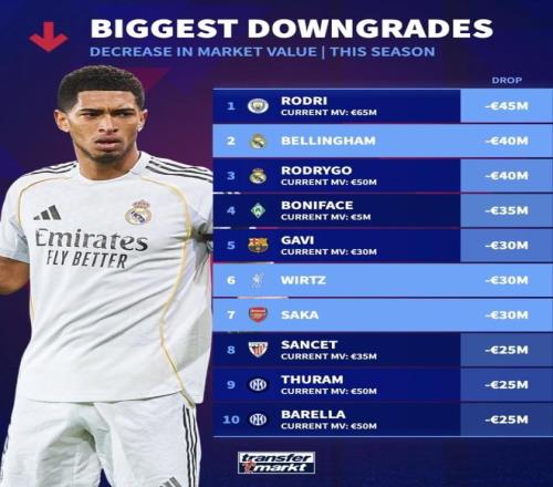 最近德转公布了2025年7月1日以来的球员身价跌幅榜,罗德里、贝林厄姆、罗德里戈、博尼费斯、加维、维尔茨、萨卡、桑切特、图拉姆、巴雷拉这十个人排在了前十。乍一看,这群球星好像集体“缩水”了,但如果你真盯着最近的比赛、伤病名单和球队环境看,就会发现每个人掉价的原因根本不在一个频道上。