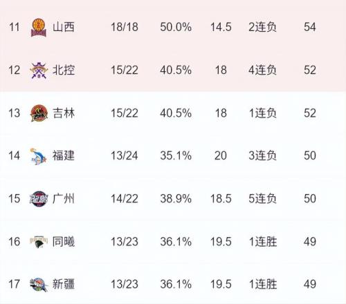 目前常规赛第12名到第17名的排名和战绩分别是:北控男篮和吉林男篮的15胜22负、福建男篮的13胜24负;广州男篮的14胜22负(少赛一场)、南京男篮和新疆男篮的13胜23负(少赛一场);在常规赛还剩下5-6场的情况下,这六支球队均具备冲击季后赛附加赛的可能性。