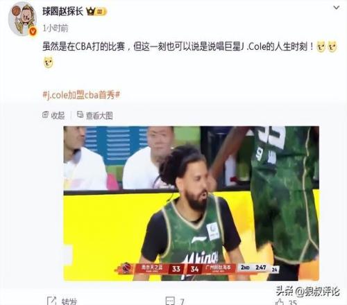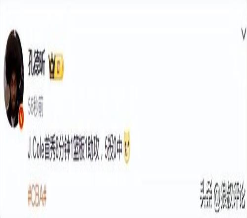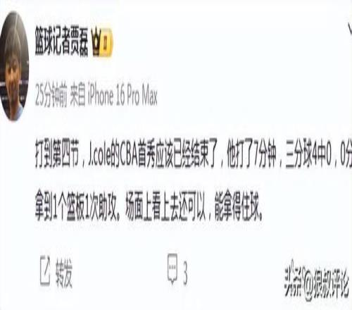 篮球记者贾磊发文点评说道:打到第四节,J.cole的CBA首秀应该已经结束了,他打了7分钟,三分球4中0,0分拿到1个篮板1次助攻。场面上看上去还可以,能拿得住球。