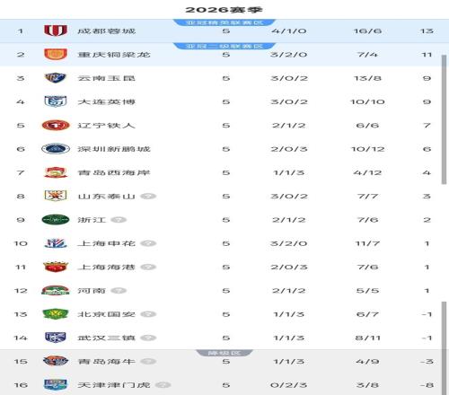至此,第5轮比赛全部结束,5轮过后仅剩成都蓉城、重庆铜梁龙、上海申花保持不败,不过3支球队的排名差异很大。