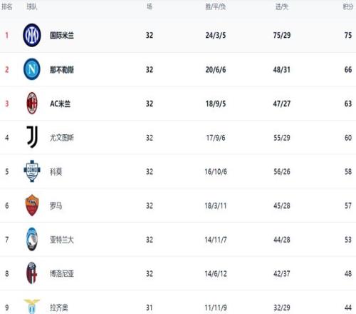 在积分榜上,国际米兰遥遥领先。国际米兰24胜3平5负,拿到75分。而本轮那不勒斯和AC米兰都丢分了,让国际米兰的优势继续扩大。那不勒斯66分排名第2,落后国际米兰9分。AC米兰只拿到63分,排名第3。尤文图斯60分,排名第4。科莫输球后依然是58分,无缘超越尤文图斯,排名第5。罗马以57分排名第6。第7的是亚特兰大,拿到53分。