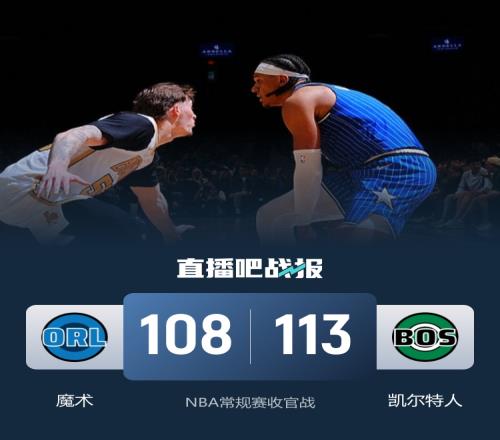 上半场,两队开场便陷入缠斗,比分始终紧咬,魔术持续发力打出11-2的攻击波取得领先,次节小瓦格纳中投将分差拉开到两位数,凯尔特人内外开花努力追赶,魔术稳扎稳打保持优势,半场战罢魔术61-52领先凯尔特人。下半场,凯尔特人火力全开,单节轰进9记三分净胜魔术22分,末节魔术打出14-3缩小分差,但此后再度断电,凯尔特人稳扎稳打保持优势,班凯罗继续失误,最终,残阵凯尔特人113-108力克魔术,主场过关。