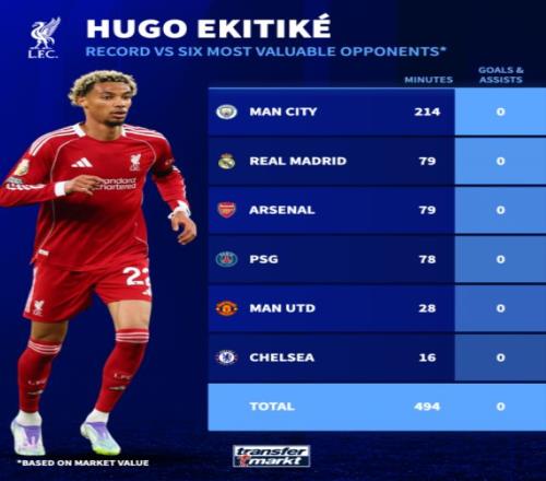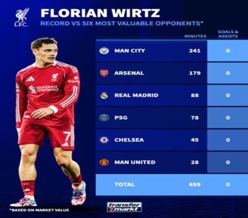 相比之下,埃基蒂克本赛季表现稍好一些,44场比赛贡献了23个进球或助攻;而维尔茨则没能复制他在德甲的出色状态。