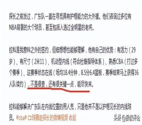 媒体人赵探长发文点评说道:广东队一直在寻觅具有护框能力的大外援。他们咨询过多位有NBA背景的大个球员,甚至包括入选过全明星的老将。
