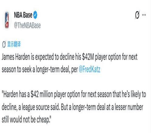 北京时间4月17日,据The Athletic(TA)报道,联盟消息人士透露:哈登下赛季拥有4200万美元球员选项,他大概率会选择跳出。即便后续签下一份年薪更低的长期合同,薪资总价依旧不菲。