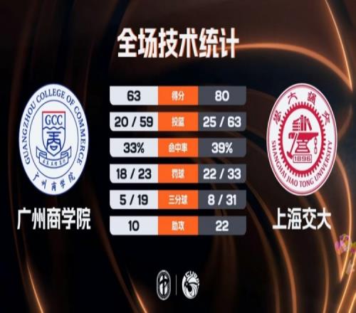 末节比赛,广州商学院的命中率再次下滑,上海交大没有再给他们任何机会,分差很快就拉开到两位数并且直逼二十分,比赛彻底失去悬念,最终上海交大80-63轻取广州商学院成功进入半决赛。