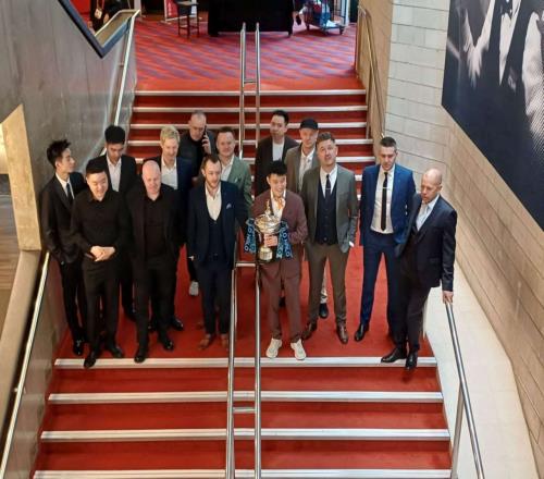 体育播报04月17日宣 斯诺克世锦赛将在4月18日-5月4日在谢尔菲德克鲁斯堡剧院进行,赛前16位种子选手进行合影留念,卫冕冠军赵心童手捧冠军奖杯占据绝对C位,奥沙利文和特鲁姆普没有现身。