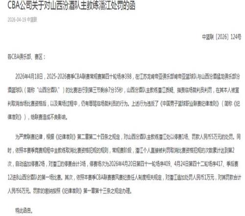 其次,依照本赛季CBA联赛赛风赛纪责任人制度相关规定,对潘江追加处罚1万元,对其罚款合计6万元,罚款的缴纳按照《纪律准则》第一章第十三条之规定办理。