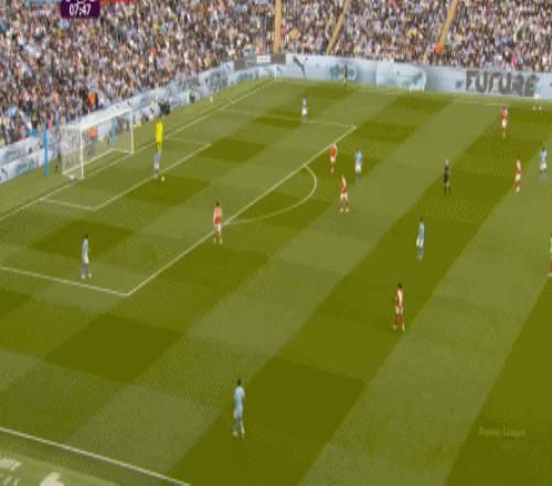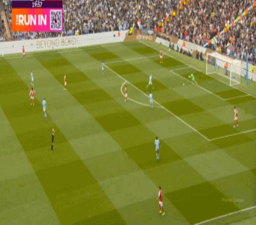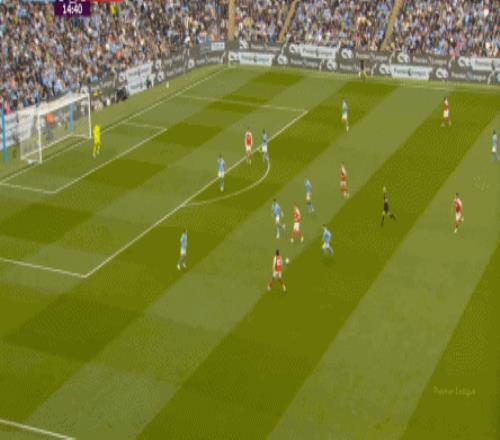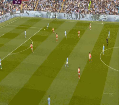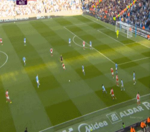 就在这次进攻之后,曼城从后场开始启动,奥赖利的一次斜向跑位绕到了马丁内利的身后,但在这个时候你也可以看到,近期赛程更为沉重的阿森纳其实已经有点脱节了,中后场球员已经不太能跟得上了: