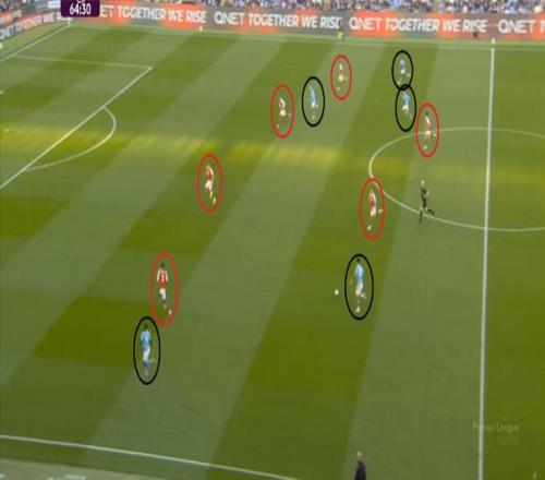 这是一个相当激进的逼抢思路,如果选用的球员在跑动、变向上稍有不足,从而给曼城露出哪怕是几度的角度或者几秒的时间,曼城就有可能层层剥茧,一步步打到阿森纳的两线之间,威胁到最后三人防守的防线。
