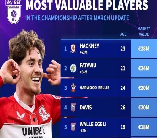德转更新后英冠球员身价前10:米堡中场哈克尼2800万欧元第1