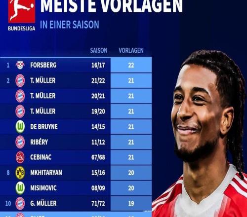 奥利塞本赛季德甲已送出18次助攻,距离德甲单赛季纪录还差4次
