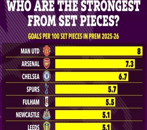 曼联本赛季每100次定位球收获8粒进球,效率高于枪手领跑英超