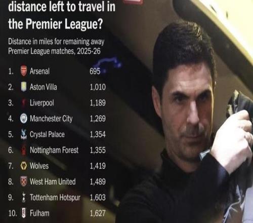 TA列英超各队剩余客场行程距离:阿森纳最少,曼城为其两倍