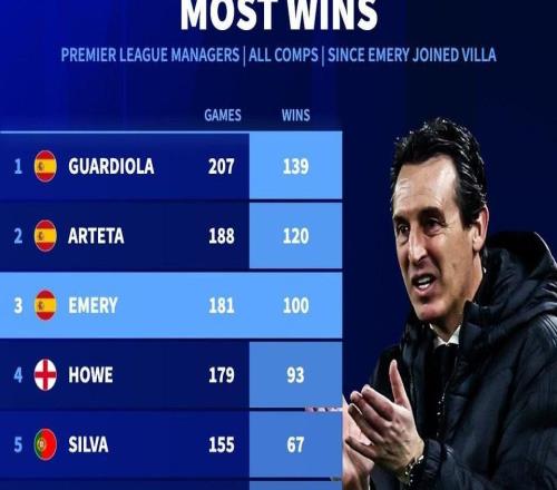 埃梅里接手维拉后181战100胜,同期英超主帅仅次于瓜帅和塔帅