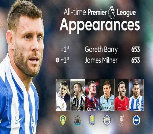 653场,40岁老将米尔纳追平英超历史出场纪录