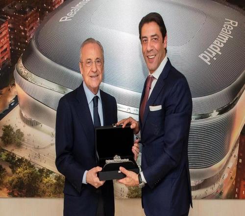欧冠开赛前,老佛爷与本菲卡主席鲁伊科斯塔交换礼物