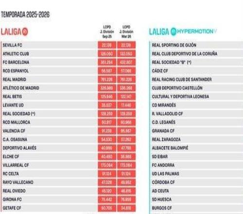 西甲官方更新工资帽:巴萨从3.51亿欧元提高到4.32亿欧