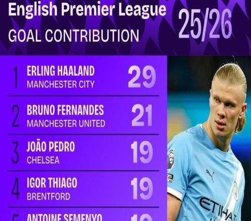 本赛季英超参与进球榜:哈兰德29球居首,B费21球次席