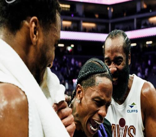 TravisScott现场观战哈登骑士首秀,两人赛后激情相拥