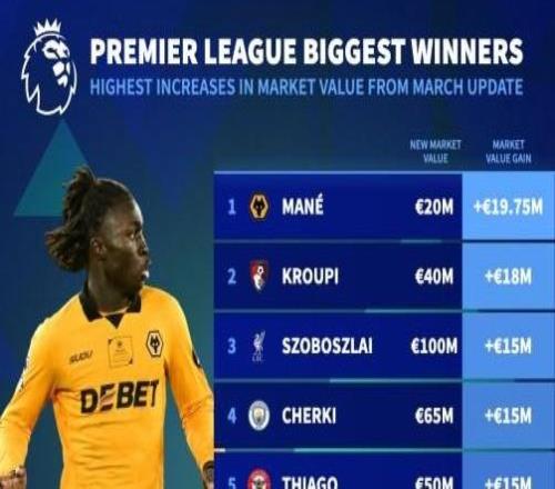 英超身价涨幅榜:索博斯洛伊上涨1500万欧达1亿,谢尔基上涨1500万欧