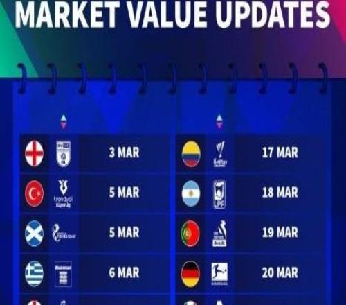 德转身价更新时间:英超3月9日,西甲3月16日,德甲3月20日