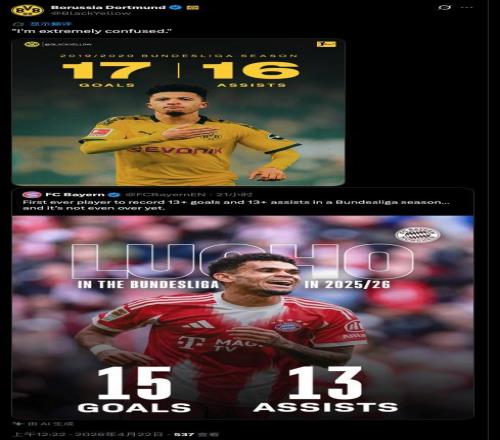 拜仁官方“吹”路易斯迪亚斯表现,多特官方用桑乔数据指正