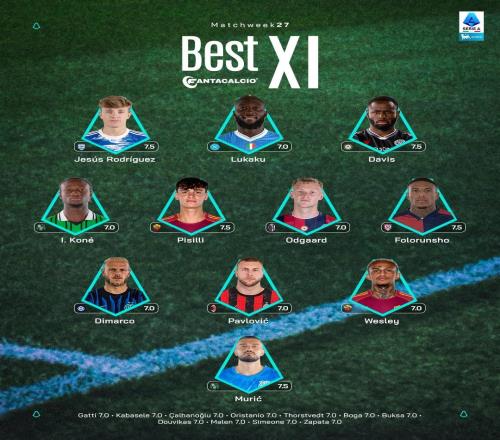 意甲第27轮最佳阵容:卢卡库、迪马尔科、帕夫洛维奇入选